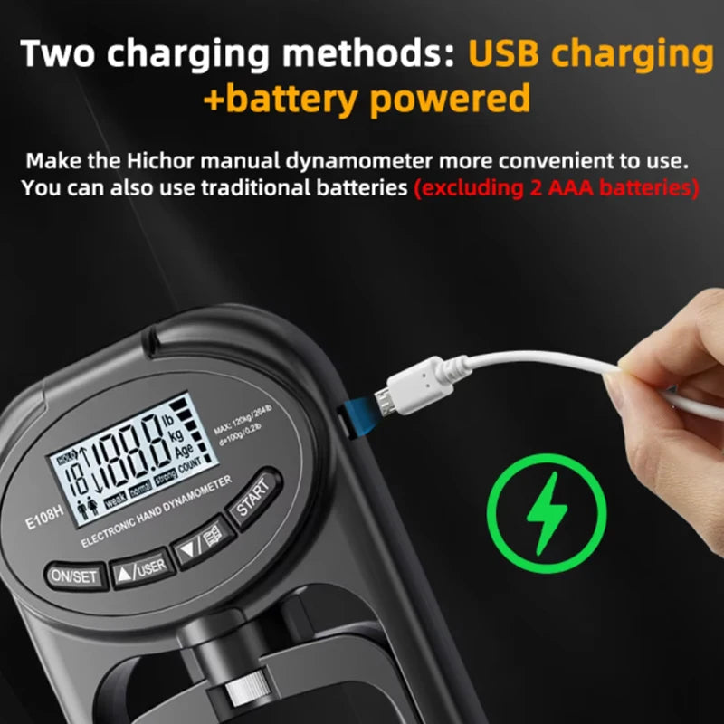 [Bright Screen Display & USB Charging]The newly upgraded bright screen function of grip strength tester allows you to clearly see the readings of the grip strength tester in a dark environment. It can be recharged with a USB cable, which is more environmentally friendly. Traditional AAA batteries (Not included) can also be used.