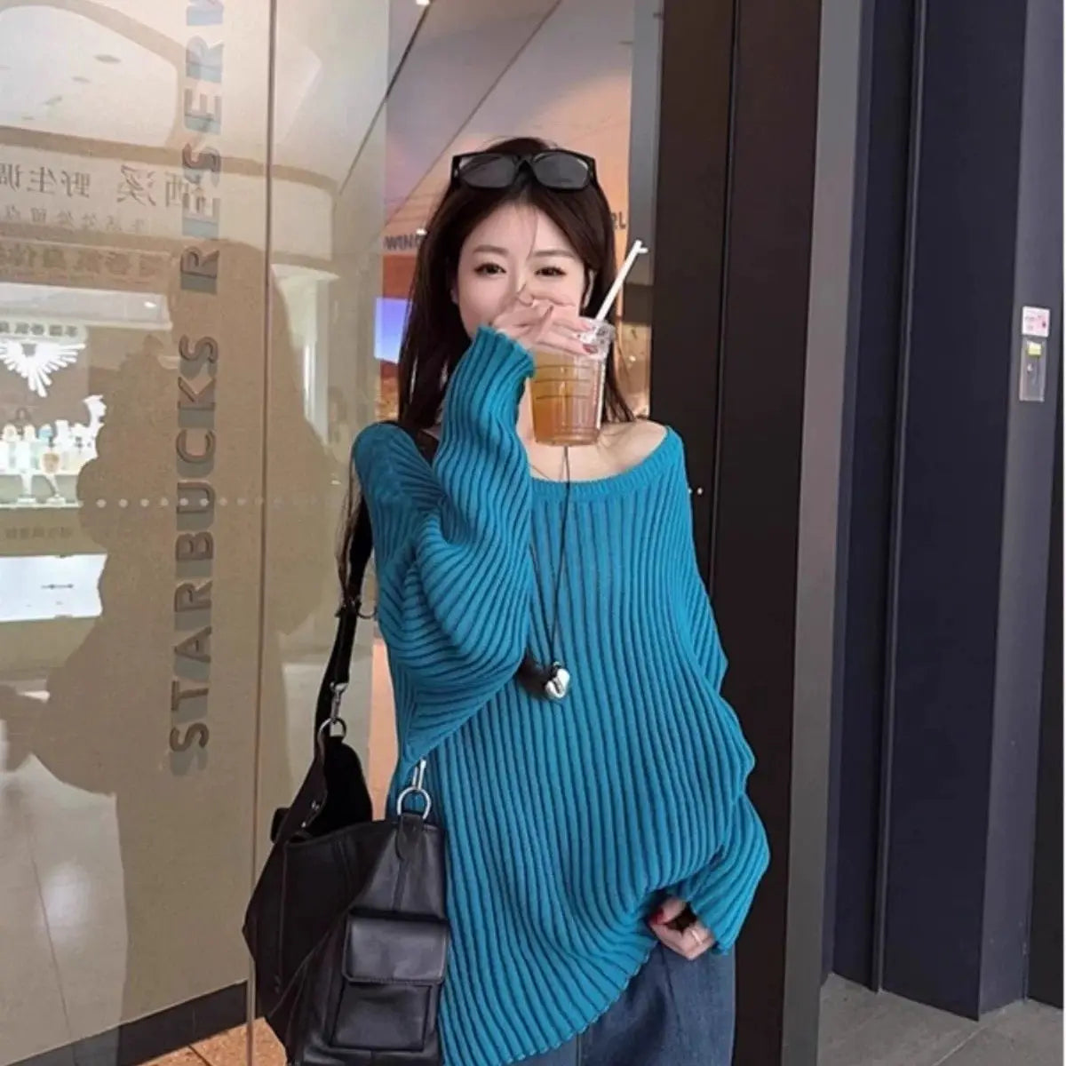 Hollow Out Knitted Stripe Slash Neck Sweater Women Oversize Autumn Winter Long Sleeve Lady Pullovers Lazy Style Blouse Sweater