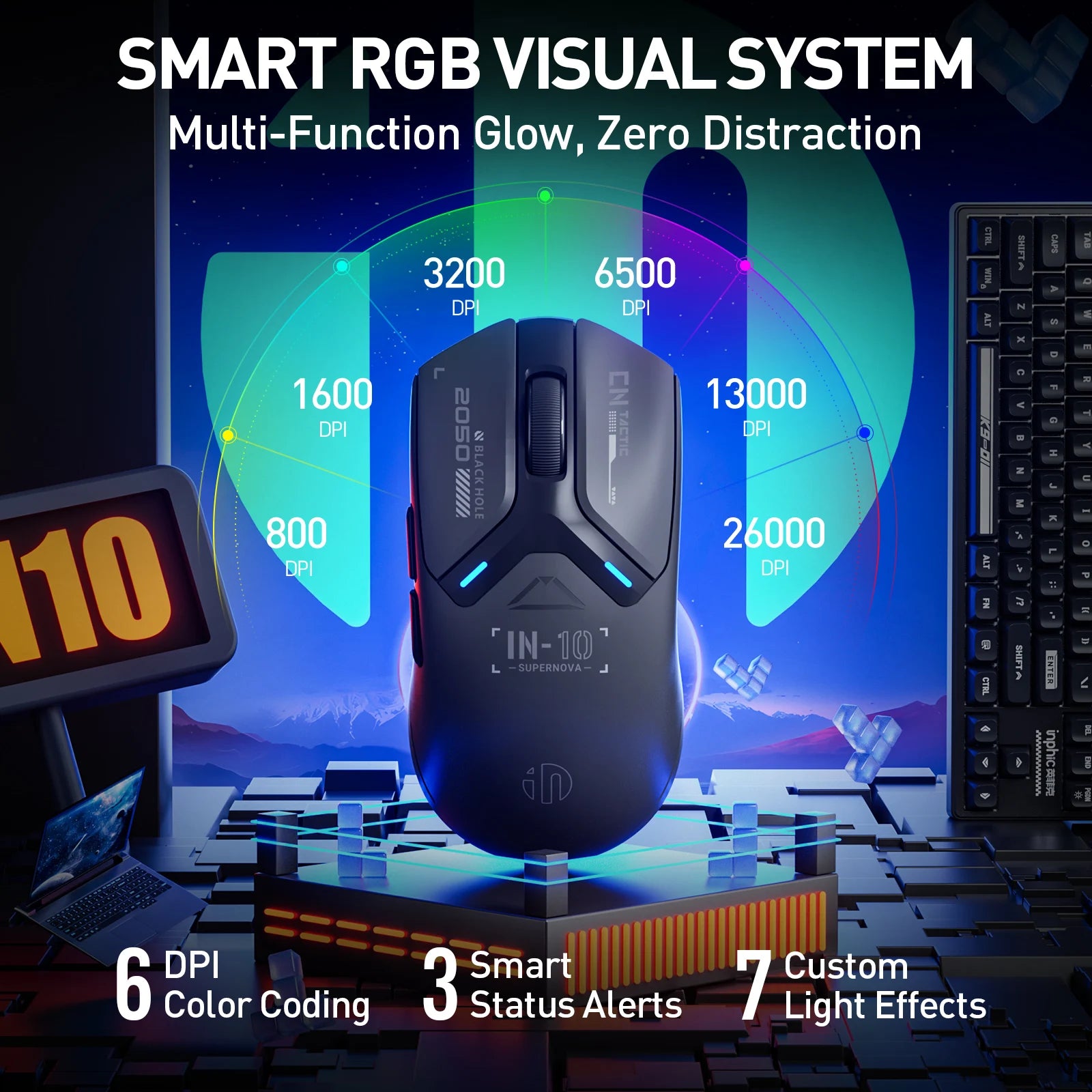 INPHIC IN10P Wireless Gaming Mouse: 26K DPI, 8K Polling, 100M Clicks, PAW3395, Triple Mode (BT/Wired/2.4G), Lightweight