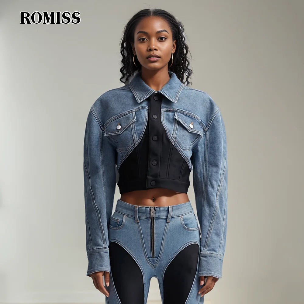 ROMISS women's casual color -colored denim jacket lavage long -sleeved single -breasted street installation retro slim jacket