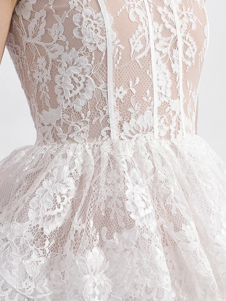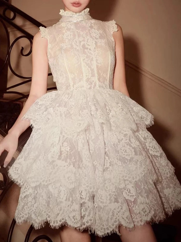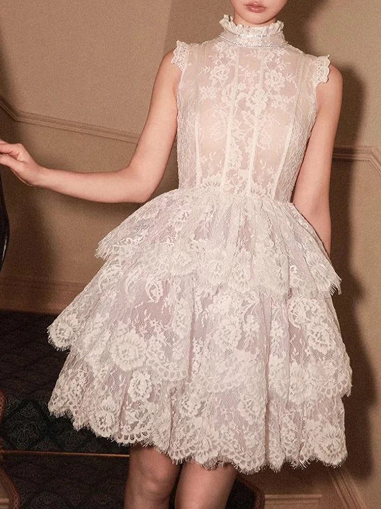 UCXQ French Style Birthday Dress For Womern O-neck Sleeveless Lace Patchwork Hollow Out Female Mini Cake Dresses 23Z1978