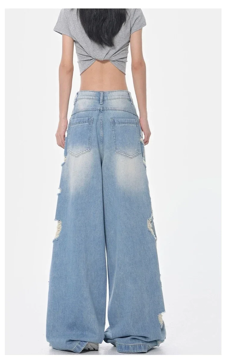 Vintage Blue Ripped Jeans women Streetwear 90s American Retro Y2k Denim Pants 2000s High Waist Straight Loose Casual Trousers
